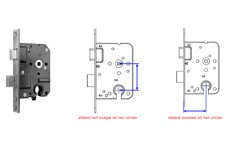 Let u op bij het kopen van een insteekslot dat de maten overéén stemmen met de andere onderdelen van het slot en met het gat in de deur. Bij een houten deur kan er worden geschaafd om het gat groter te maken, maar een gat kleiner maken gaat niet. Of heeft u een insteekslot nodig voor een ijzeren of aluminium deur? Dan moet het slot precies in de deur passen. Om de juiste grootte van het insteekslot te bepalen neemt u :